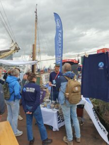 Our participation spanned both water and shore: aboard the Vrijbuiter, and on land with the Fair Winds Collective at our stand on the Kop van Java, Java-eiland. Across these three days, we connected with visitors and fellow ocean advocates, shared our mission, sold merchandise, and unveiled our striking new Nikon collaboration banners, which stood tall among the sea of masts and sails.